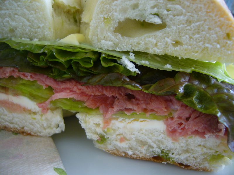 ローストビーフのソースをかけて、レタスにマヨネーズを少々。